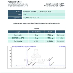 CJC-1295 + IPA is a synthetic peptide that is currently being studied in growth hormone research. Our high-quality peptide is available in 5mg and 10mg sizes. The product comes in a lyophilized powder form in a 3mL vial that requires bacteriostatic water to reconstitute from solid to liquid form.